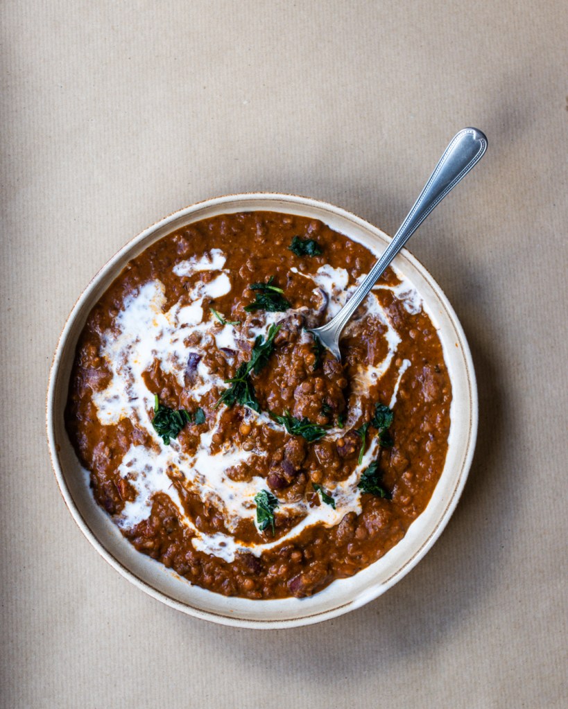 Lejjebb veszem a fokozatot, adok hozzá egy kiskanál chilit, 2 kiskanál garam masala fűszerkeveréket, fél kiskanál őrölt fahéjat és egy nagyobb csipet sót. Jól elkeverem és hagyom, hogy az ízek összeérjenek. (A fűszereknek jobban kijön az íze az ételben, ha olajon megpirulnak.) Adok hozzá 2-3 evőkanál sűrített paradicsomot, 3,5 deciliter zöldség alaplevet (nekem ez a legtöbbször víz és vegán zöldségkocka – nem hiába van megúszós a recept címében), egy-egy konzerv leszűrt vesebabot, illetve lencsét, majd magas fokozaton elkezdem felforralni. Ha felforrt, újra visszaveszem a hőfokot, teszek rá egy fedőt és húsz percig hagyom főni.