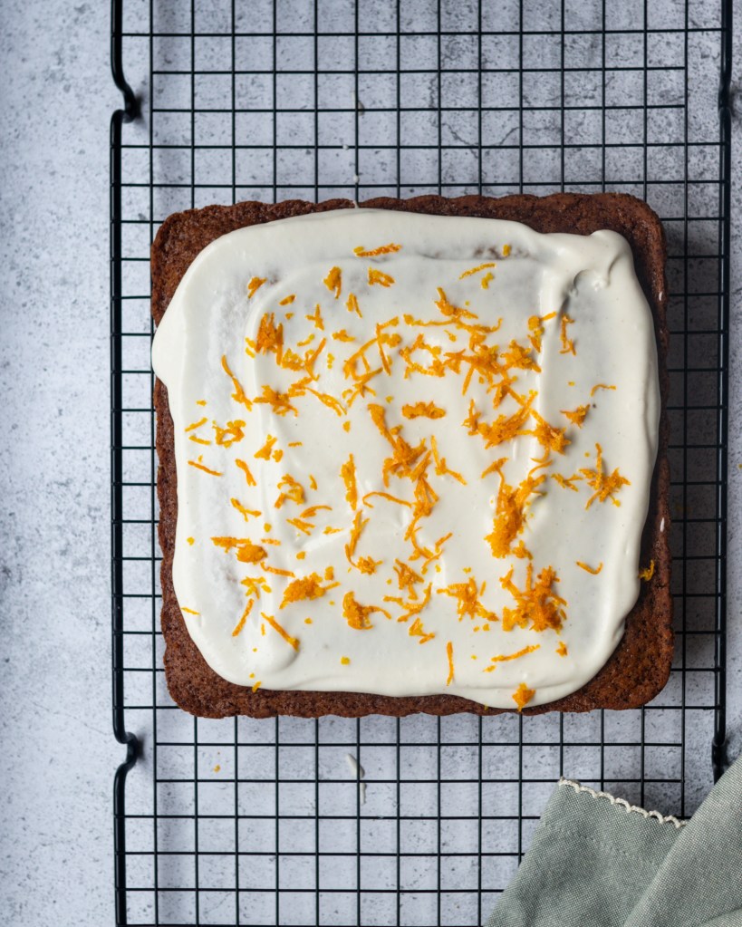 Ha elkészültem, megkenem vele a süteményt, a tetejére pedig a narancs reszelt héját szórom.
