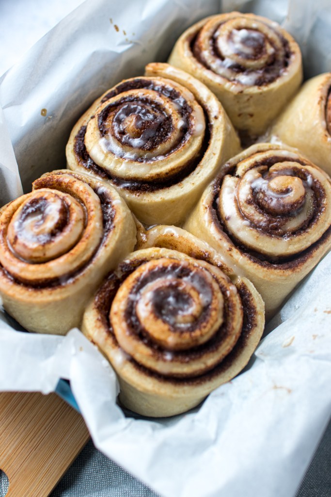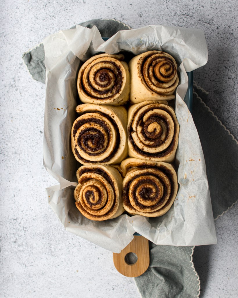 Ha megvagyok mind a hattal, előmelegítem a sütőt 180 fokra, addig hagyom pihenni picit a tésztát. Ha eléri a hőfokot a sütő, 2 evőkanál növényi tejjel megkenem a csigák tetejét, majd 31-32 percig sütöm őket alsó-felső sütéssel.