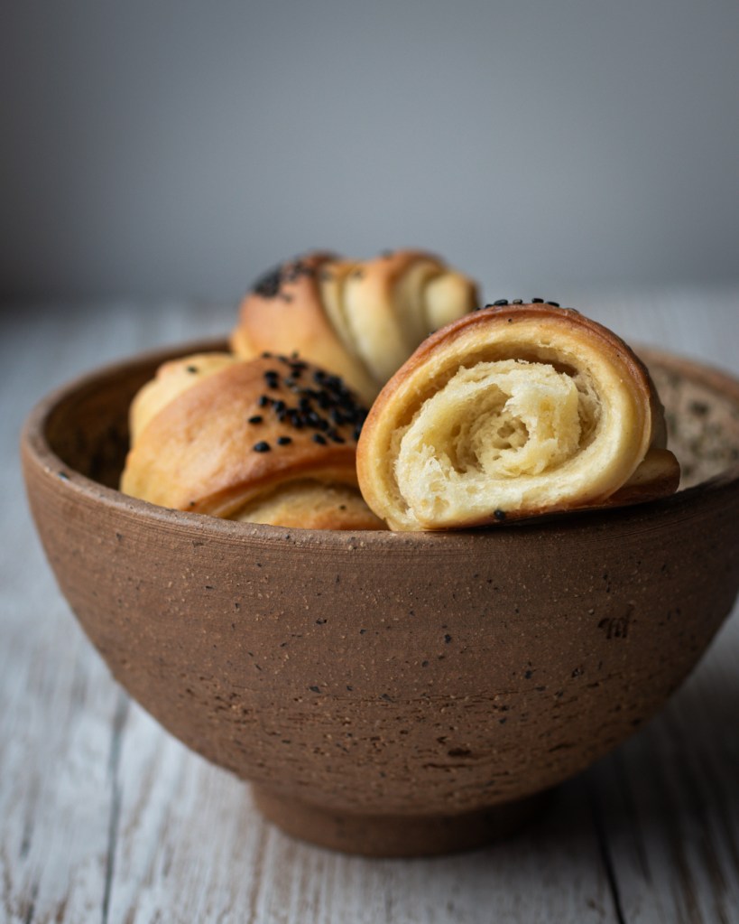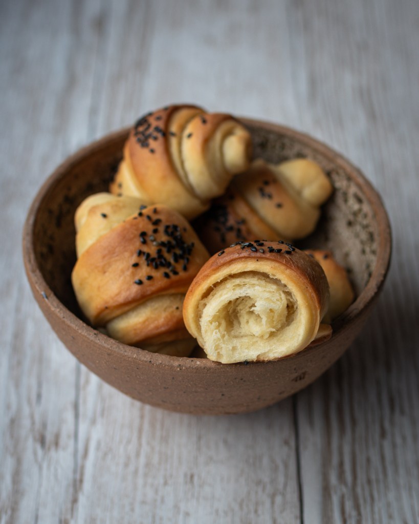 Az 50. percnél bekapcsolom a sütőt és 180 fokra állítom. A kifliket megkenem kevés növényi tejjel, majd megszórom őket fekete szezámmaggal. Az előmelegített sütőben 15-16 percig sütöm alsó-felső sütéssel – a lényeg, hogy akkor van kész, ha picit barna a tetejük.